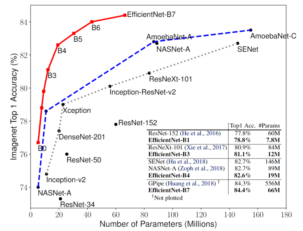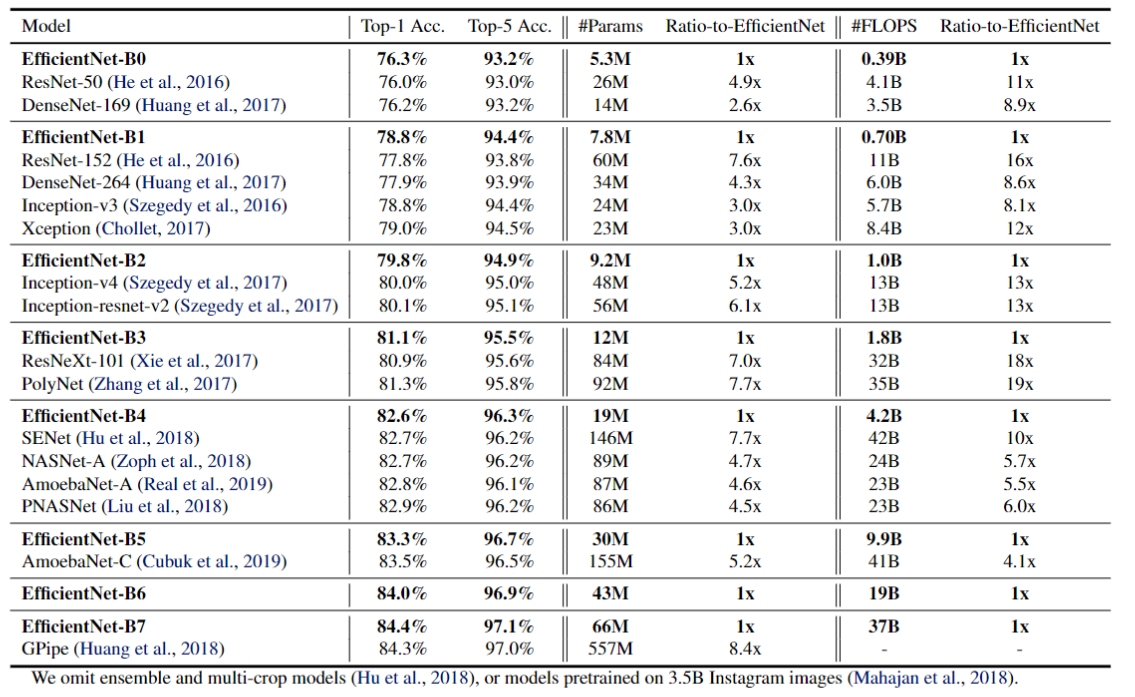 最后是原论文中关于EfficientNet与当时主流网络的性能参数对比: