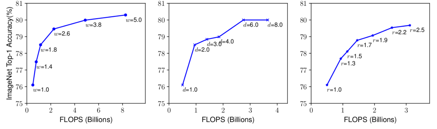 下图展示了在基准EfficientNetB-0上分别增加width、depth以及resolution后得到的统计结果。通过下图可以看出大概在Accuracy达到80%时就趋于饱和了。