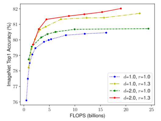 接着作者又做了一个实验,采用不同的d , r 组合,然后不断改变网络的width就得到了如下图所示的4条曲线,通过分析可以发现在相同的FLOPs下,同时增加d和r的效果最好。