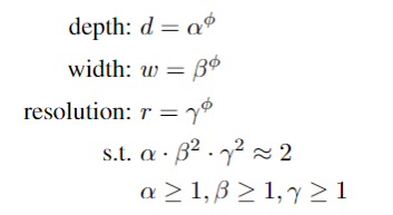 然后,作者又提出了一种新的复合缩放方法使用了一个复合系数ϕ ,通过这个系数按照以下原则来统一的缩放网络深度、宽度和分辨率: