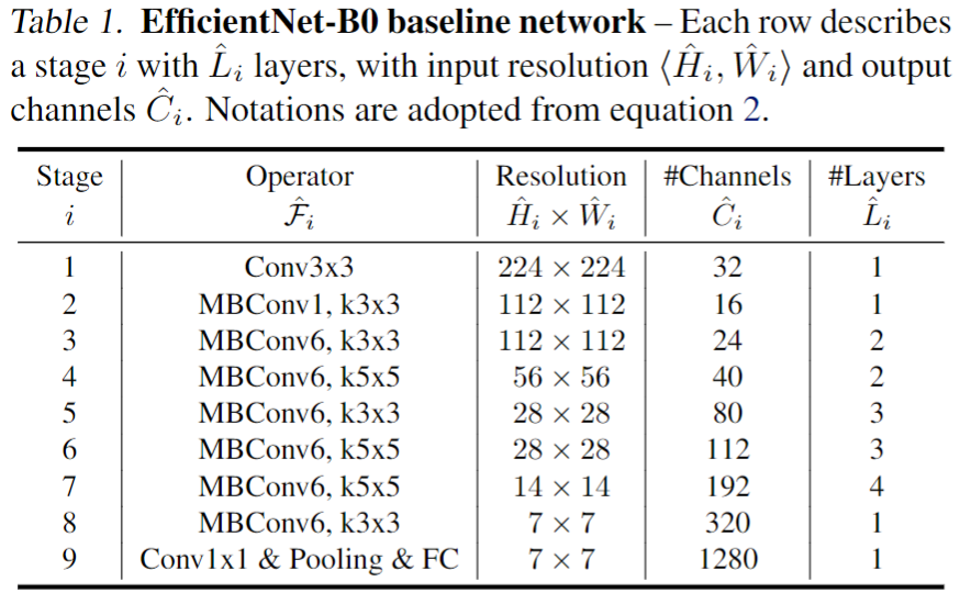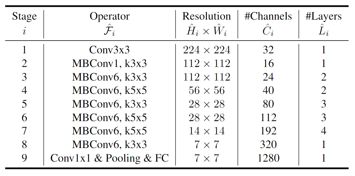 为了方便后续理解,我们先看下论文中通过NAS(Neural Architecture Search)技术搜索得到的EfficientNetB0的结构,如下图所示,整个网络框架由一系列Stage,$\widehat{Fi}$表示对应stage的运算操作,$\widehat{Li}$表示在该stage中重复$\widehat{Fi}$的次数: