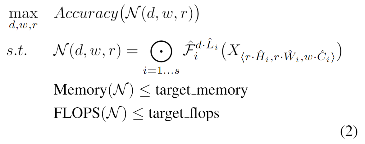 为了探究d,r,w这三个因子对最终准确率的影响,作者将d,r,w加到公式中,我们可以得到抽象化后的优化问题(在指定资源限制下),其中s.t.代表限制条件: