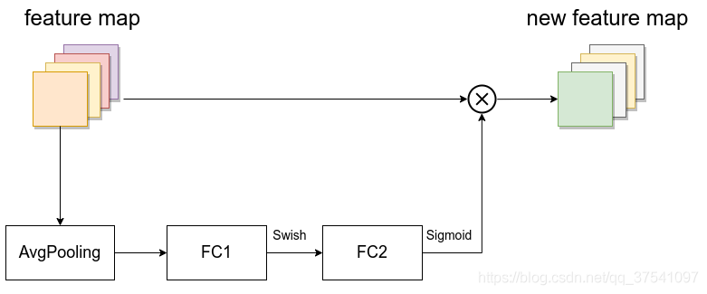 - SE模块如下所示,由==一个全局平均池化==,==两个全连接层==组成。第一个全连接层的节点个数是输入该MBConv特征矩阵channels的$\frac{1}{4}$ 且使用Swish激活函数。第二个全连接层的节点个数等于Depthwise Conv层输出的特征矩阵channels,且使用Sigmoid激活函数。